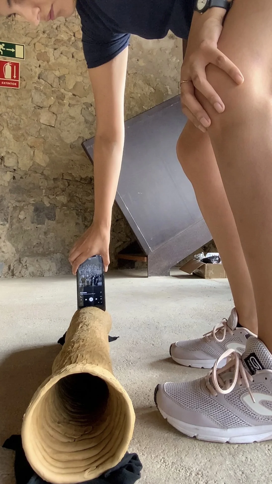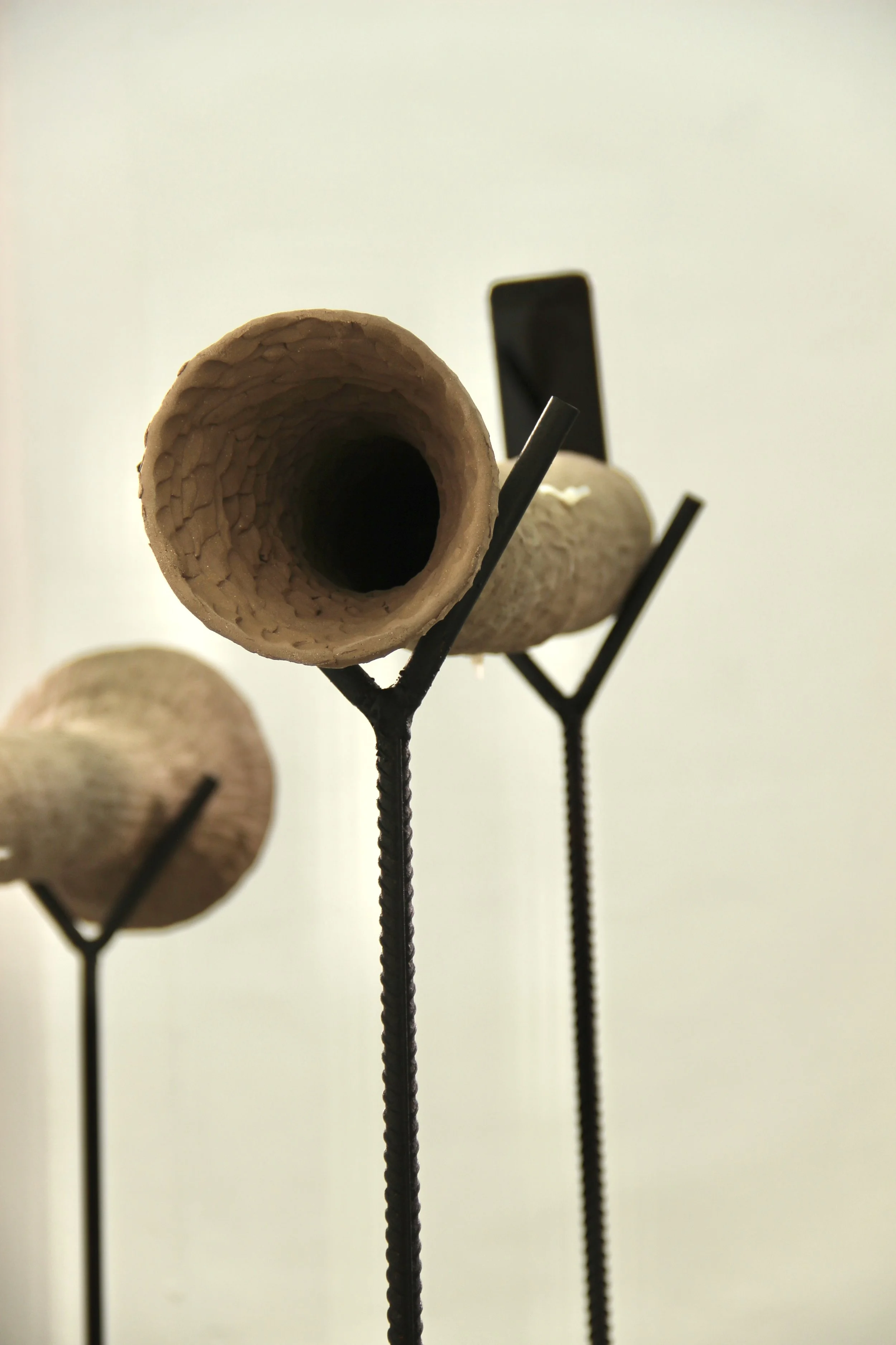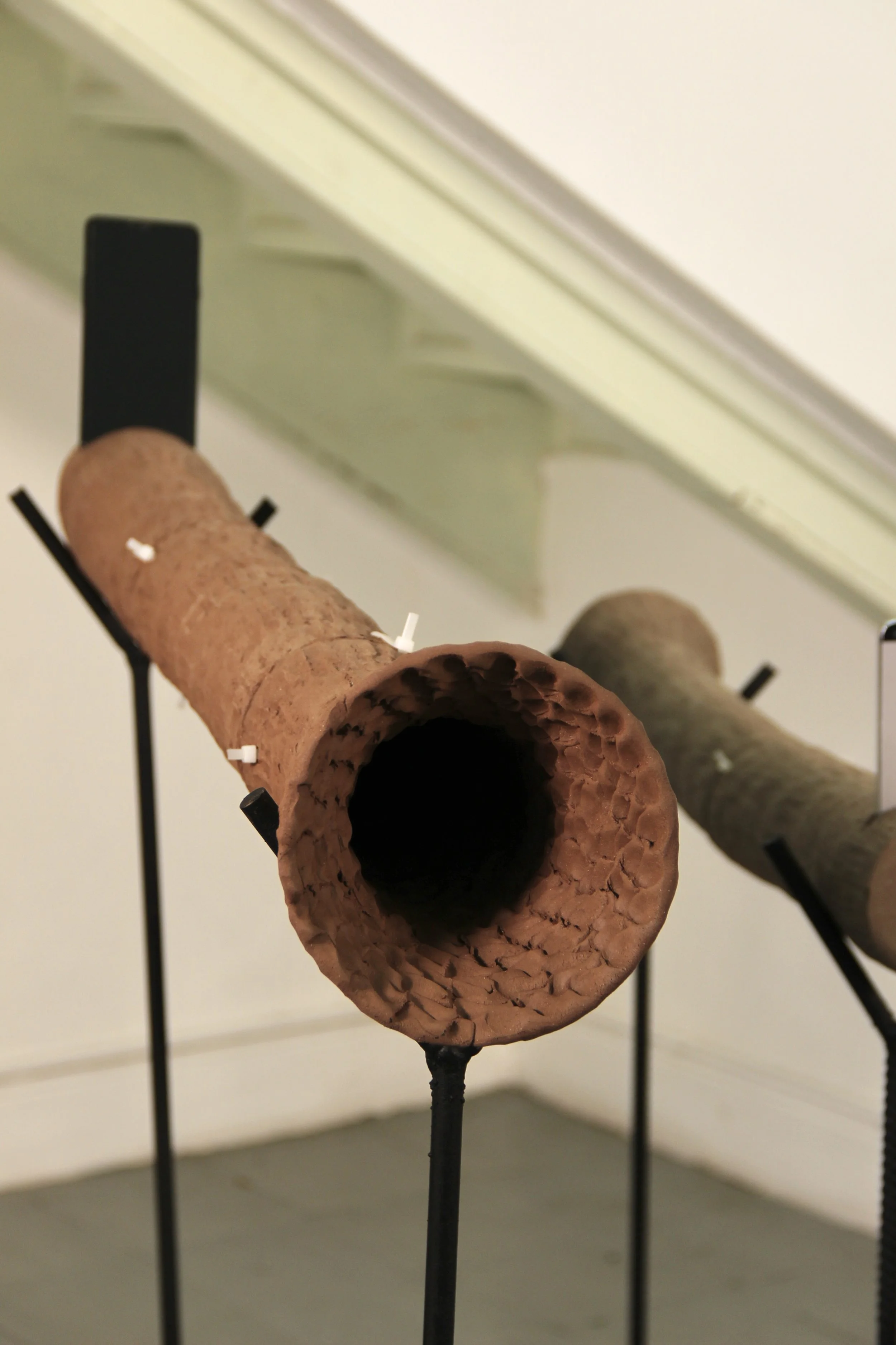 “En su segundo mes de residencia, Luisa presenta dos piezas realizadas en arcilla sin cocer. Se trata de la reproducción de antiguos instrumentos de la cultura Mapuche llamados Trutruka. Las Trutruka originales, de varios metros de longitud y realizados con “colihue” (caña en mapundungún -la lengua mapuche-) servían de altavoces para elevar cánticos rituales. Para la realización de estas piezas, Luisa utiliza la técnica de cerámica original Mapuche, que da forma a las piezas a base de “lulos” -rollos alargados de arcilla- que se van uniendo con digitopresión. Esta técnica ha sido la base de todos los utensilios de cerámica con fin práctico realizados por esta cultura. A través de estos “Trutrukas” contemporáneos, podemos escuchar relatos y archivos del pasado cultural mapuche, reproducidos por teléfonos móviles y leídos por una voz de inteligencia artificial. El pueblo Mapuche es uno de los pueblos indígenas más numerosos de América del Sur, que aún habita en regiones de Chile y parte de Argentina. El trabajo de Luisa, reflexiona sobre las dificultades de ensamblar una memoria cultural fragmentada, tratando no sólo de reconstruirla y visibilizarla, sino de conectarla con la actualidad. La obra de Luisa es un gesto que intenta compartir conocimiento, que nos enseña formas posibles de existir de forma sostenible. En tiempos de colapso medioambiental y sistémico, estas culturas ancestrales traen un mensaje de vital importancia: hay formas de vida vivibles, que no se basan en el extractivismo y la destrucción del planeta que habitamos. “